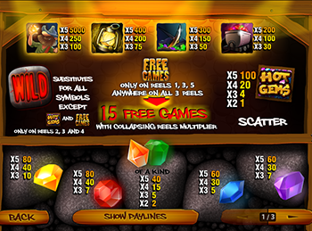 Итак, тематика аппарата связана с добычей драгоценных камней, однако это понятно из названия. На активных линиях будут появляться разнообразные символы: добытчик золота и камней, фонарь, кирка, вагонетка, драгоценные камни. Не обошлось здесь и без специальных символов. Вайлдом стала пиктограмма с соответствующей надписью «Wild», а Скаттером, который предоставляет право на 15 фриспинов – картинка, на которой написано «Free Games».