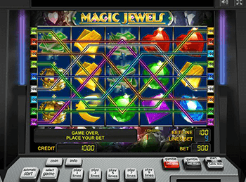 Слот-машина Magic Jewels от Novomatic, где сюжет посвящается драгоценностям. Когда новые игры загрузятся, на дисплее покажется внутреннее пространство пещеры, где на стенах красуются разноцветные кристаллы. На фоне этой картинки запустившие игровой аппарат гэмблеры заметят синеватые вращающиеся элементы, разделенные тонкими желтоватыми линиями.